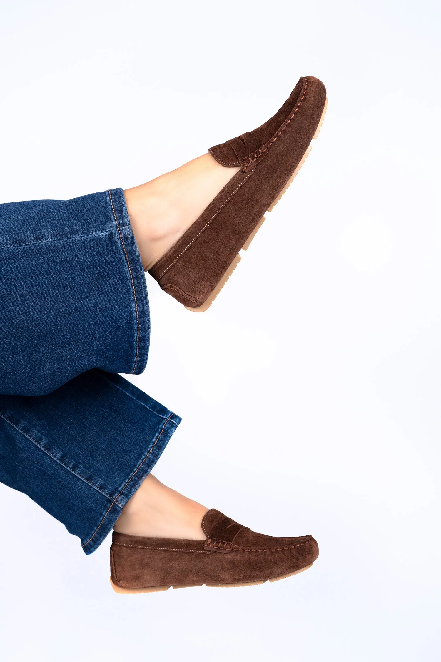 Women's brown suede flat shoes on woman foot model, studio footwear fashion photography