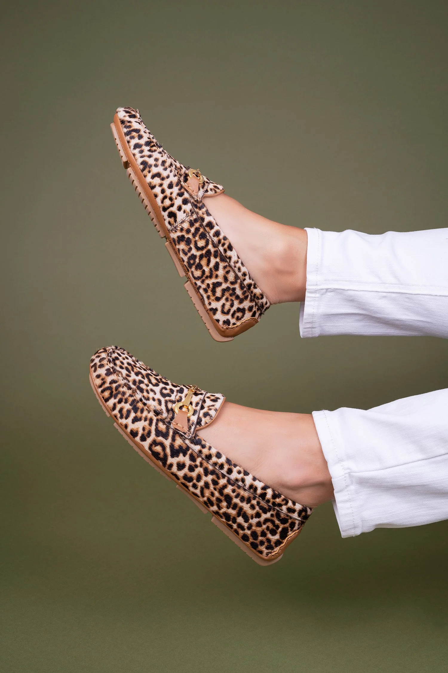 Women's Leopard print flat shoes on foot model, studio commercial product photography, Fashion footwear photography.